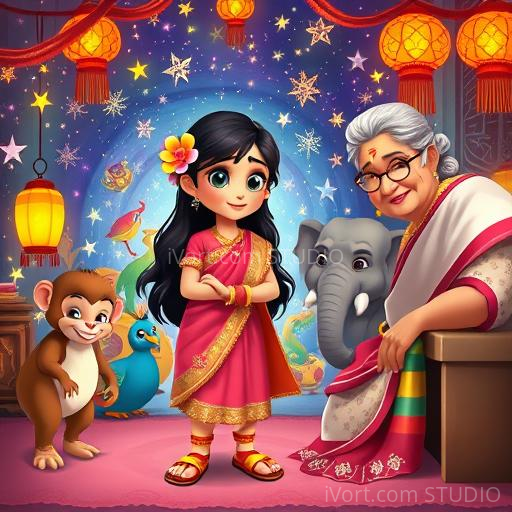 Anya stepped into the tunnel, and suddenly, she was in a wondrous place! The walls sparkled with tiny stars, and colorful lanterns hung from the ceiling, casting a warm glow. She saw friendly animals wearing bright saris and dhotis—peacocks, monkeys, and even a wise old elephant. They welcomed her with cheerful smiles, inviting her to explore this enchanted Indian land filled with music, dance, and delicious smells of spices and sweets. Anya felt happy and brave, ready for her new adventure.