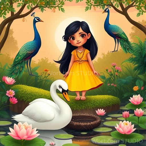 Anika decided to follow the swan's gentle trail along the riverbank. As she tiptoed through the tall grass, she reached a quiet, shimmering swamp surrounded by blooming lotuses and peacocks calling in the distance. There, she saw the swan resting on a bed of soft moss, its eyes closed peacefully. Nearby, she noticed a tiny, shimmering nest made of twigs and colorful flowers, hidden beneath the reeds. Anika realized the swan was caring for its secret home, and she felt a warm sense of respect and wonder for the gentle creature’s quiet life.