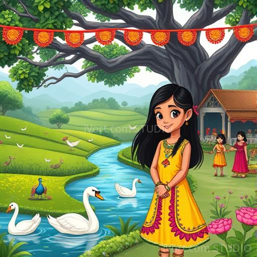 From that day on, Anika shared the story of the swan and the banyan’s secret with everyone. The villagers began to see their surroundings with new eyes—respecting the river, the trees, and all creatures that lived there. They planted more flowers, cared for the animals, and celebrated festivals with joy and gratitude. The swan continued to glide gracefully across the river, a symbol of peace and kindness. Anika felt happy knowing that her curiosity had helped protect her village’s magic. She learned that caring for nature and sharing stories could keep the spirit of harmony alive forever.