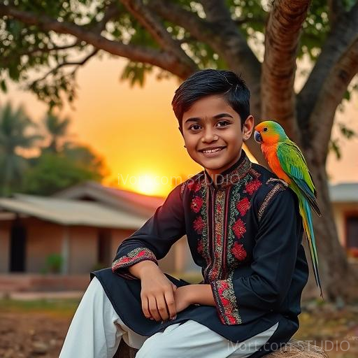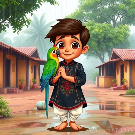 One monsoon morning in a vibrant Indian village, Ravi, a curious boy with bright eyes and a cheerful smile, notices dark clouds gathering overhead. Suddenly, the rain begins to pour heavily, turning the village streets into shimmering streams. Ravi’s pet parrot, Mithu, flutters nervously, seeking shelter. Ravi feels a pang of worry—how will everyone stay dry and safe in this sudden storm?