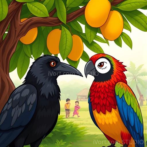 In a lush Indian village, near a sparkling pond surrounded by mango trees, lived a clever crow named Kavi. One hot afternoon, Kavi noticed a shiny, juicy mango hanging from a branch. As he admired the fruit, a sneaky snake named Saanp slithered nearby, eyeing the mango greedily. Saanp hissed softly, thinking of how delicious the mango would be for his lunch. Kavi, quick-witted and calm, decided to find a clever way to protect the mango and teach Saanp a lesson about greed.