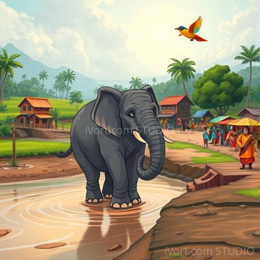 In a lively Indian village nestled between lush green fields and colorful markets, a tiny sparrow named Chikki was curious about everything. One morning, she noticed a big, gentle elephant named Gaja walking past her tree. Gaja’s enormous foot had left a deep footprint in the soft earth, and Chikki wondered what it would be like to be that big. She decided to find out if she could learn from Gaja and maybe even help him someday. Her tiny heart was filled with excitement and a little bit of nervousness as she fluttered closer.