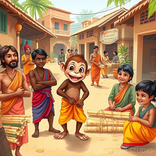 In a lively Indian village, a mischievous monkey named Chiku loved mangoes more than anything. One sunny morning, he heard about the biggest, juiciest mango hanging from the tallest tree in the village square. Chiku’s eyes sparkled with curiosity. But how could he reach such a high mango? He decided to go on a fun adventure to find a way to get it, feeling excited and a little nervous about the challenge ahead.