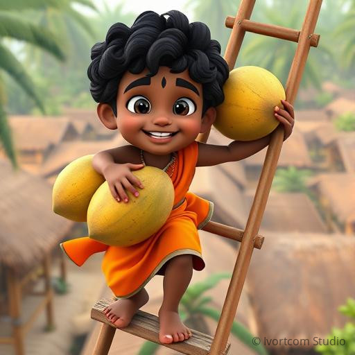 Scene 1: In a quaint South Indian village, young Kannan, with his curly black hair and bright orange dhoti, sets out on a coconut quest. The sun shines brightly over the lush green fields and colorful houses.