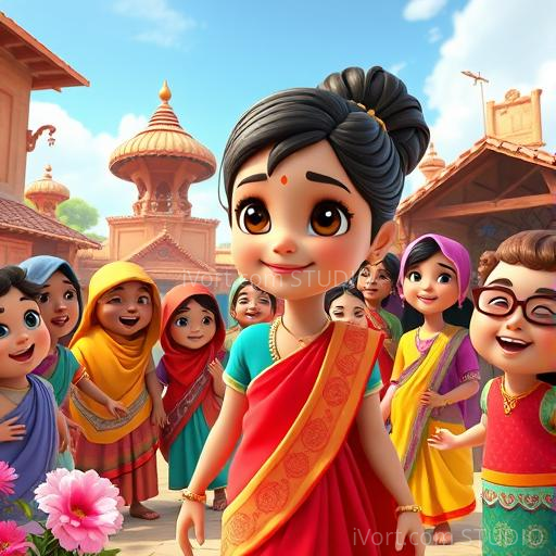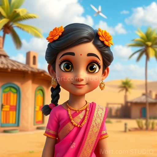In a lively Indian desert village, little Rani, a curious girl with sparkling eyes and a colorful sari, hears a mysterious whisper carried by the warm breeze. The whisper speaks of a hidden song that can bring joy and harmony to everyone. Excited and a little nervous, Rani decides to find the secret song, believing it might help her village, which is facing a drought. She sets off on her adventure, her tiny feet crunching the golden sand as she follows the faint melody, feeling the magic of the desert around her.