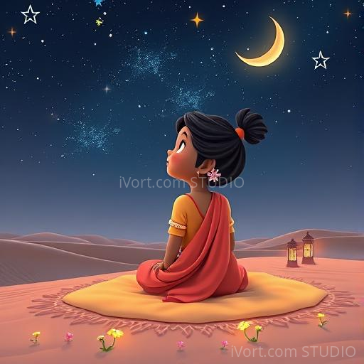That night, Rani sits under a sky bursting with twinkling stars, each one shimmering like a tiny lantern. The desert air is cool and filled with the scent of jasmine. Suddenly, the stars begin to shimmer brighter, and a gentle, enchanting tune flows down from the heavens. Rani realizes that the secret song is written in the stars themselves! With a heart full of wonder, she hums along, feeling the melody connect her to the universe and her village. She understands that the true magic is in sharing love and kindness, just like the stars share their light.