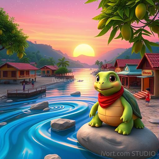In a lively Indian village nestled between lush green hills and colorful markets, there flowed a cheerful river named Rivu. But lately, Rivu had been feeling restless. Night after night, it couldn't find peace and kept bubbling with worries. The villagers noticed the river's restless splashes and wondered what was wrong. Rivu longed to sleep peacefully like the gentle lullabies sung by the wind through the mango trees but just couldn’t settle down. One bright morning, a wise old turtle named Tula decided to help Rivu find its calm. Tula told stories of the moon’s gentle glow and the stars’ twinkling dance, hoping to soothe the river’s troubled heart. As the sun set, Rivu listened to the stories, feeling a little calmer, dreaming of peaceful nights and gentle waves. The village children watched happily, learning that even the busiest rivers need rest and that sharing stories can bring peace to everyone.