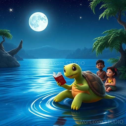 That night, as the villagers settled into their cozy homes, the moon rose high in the sky, casting a silver glow over the river. Rivu watched the moon’s gentle light dance on its surface, shimmering like tiny diamonds. The moon’s soft glow whispered lullabies from far away, telling Rivu to relax and let go of worries. The stars twinkled happily, joining in the gentle song. Rivu felt its restless splashes slow down, becoming soft ripples that shimmered peacefully. The river realized that the moon’s calm light was like a gentle hug, helping it to sleep soundly. From that night on, Rivu looked forward to the moon’s nightly visit, knowing it would bring peaceful dreams and quiet waves. The villagers smiled, happy to see their river finally resting, learning that sometimes, all we need is a little light and kindness to find peace.