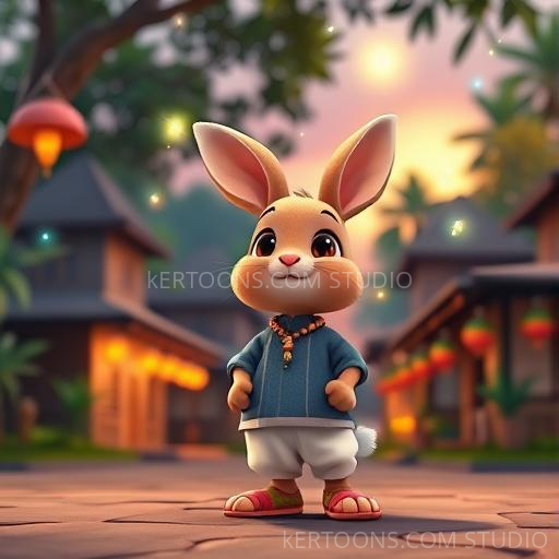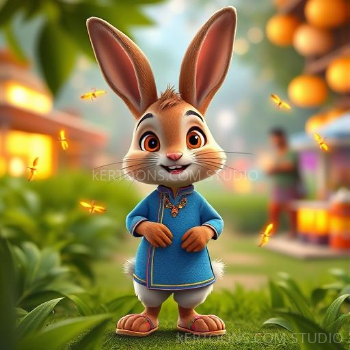 In a lively Indian village nestled between lush green fields and colorful markets, lived a curious little rabbit named Raju. One warm evening, as the sky turned a soft shade of pink, Raju noticed tiny glowing lights flickering in the air—fireflies! But these weren't ordinary fireflies; they shimmered with magical colors, dancing in patterns that looked like tiny, twinkling stars. Raju's eyes sparkled with wonder. He wondered, 'Could I dance with them too?' Feeling a mix of excitement and a little nervousness, Raju decided to follow the glowing lights into the nearby mango grove, where the fireflies danced freely among the trees, inviting him into a world of shimmering magic.