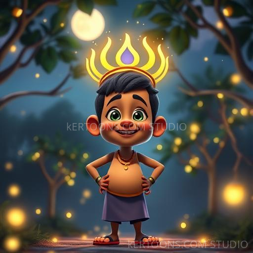 As the night deepened, the fireflies gathered around Raju, their tiny lights glowing brighter than ever. One firefly, with a shimmering blue glow, floated close and whispered, 'Raju, your kindness and courage have made us happy. We want to give you a special gift.' Suddenly, the fireflies formed a glowing crown of light above Raju’s head, illuminating the grove with a gentle, magical glow. Raju felt proud and grateful. He understood that the true magic was not just in dancing but in sharing happiness and kindness. From that night on, Raju knew that even a small heart can light up the world, just like the fireflies. And every evening, he would visit the grove to dance and share joy with his tiny friends.