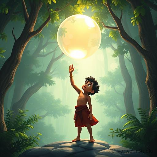 Scene 2: One day, while exploring the woods, Arjun stumbled upon a mysterious bubble floating in the air. Intrigued, he reached out and touched it, causing the bubble to burst with a loud pop.