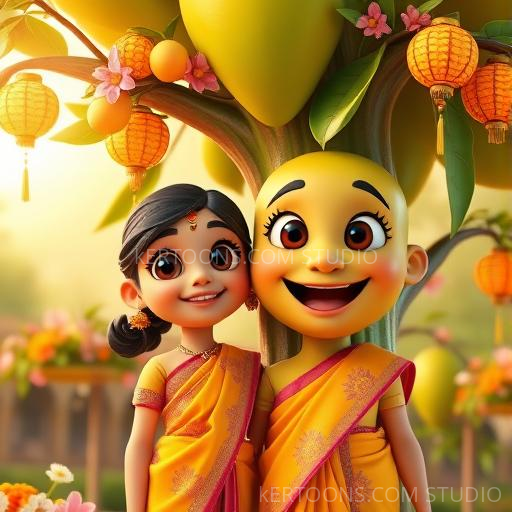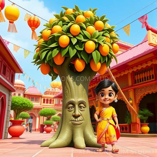 As days went by, Mangi the talking mango tree became the village’s best-kept secret. One afternoon, a curious girl named Anika, wearing a bright yellow saree with pink flowers, approached the tree. She gently touched the rough bark and asked, 'Mangi, how can you talk?' The tree softly replied, 'I’ve been waiting for a special friend like you to share my secret.' Anika’s eyes sparkled with delight. Together, they planned a surprise for the village—a festival of stories and songs, where Mangi would tell tales from ancient India about brave heroes and wise sages. The villagers gathered eagerly, excited to hear the magical stories from their extraordinary mango tree, feeling happy and proud of their unique friend.