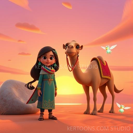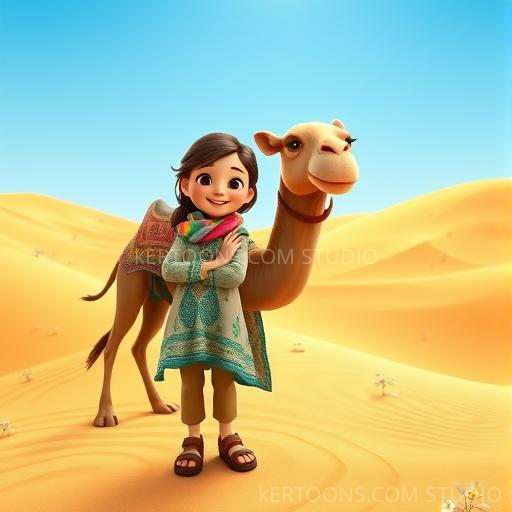 In the heart of a vast, golden desert, young Lina, a curious girl with bright eyes and a colorful scarf, hears a mysterious whisper carried by the wind. She wonders what secrets the desert holds and decides to follow the soft, whispering sound. As she walks, she notices shimmering dunes that look like giant waves and a friendly camel named Momo who joins her adventure. Together, they listen closely to the gentle whisper, which seems to tell a story of ancient treasures hidden beneath the sands. Lina feels a mix of excitement and wonder, eager to discover what lies beneath the desert’s golden blanket.