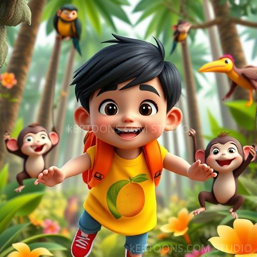 The boat gently floated into a lush jungle filled with towering trees and colorful birds singing cheerful tunes. Suddenly, the trees started to giggle! Ramu looked around in surprise as tiny monkeys swung from branches, laughing and playing. The jungle was alive with joy and mischief. Ramu learned that sharing laughter and kindness could turn even the wildest places into friends. With a big smile, he joined the playful monkeys, feeling happier than ever, knowing that friendship makes every adventure special.