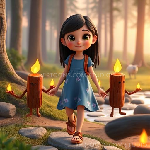 Luna and her glowing friends journey back through the woods, guided by the firewood’s gentle light. Along the way, they encounter friendly animals and shimmering streams, all part of the magical forest. Luna feels proud and joyful, knowing she’s helping her friends find their way home. As they reach the edge of the forest, the firewood’s glow dims happily, and they thank Luna with a sparkle in their flames. Luna waves goodbye, feeling grateful and inspired, knowing that kindness and bravery can light up the darkest nights.