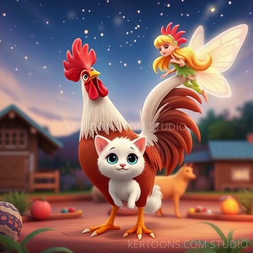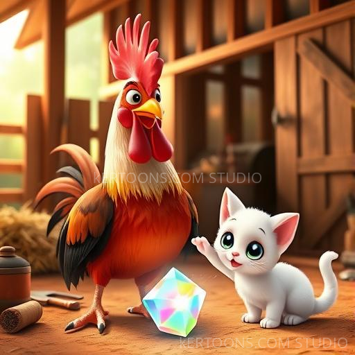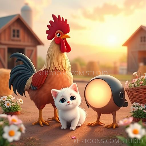 In a lively farm nestled under a bright, blue sky, a cheerful rooster named Rocky and a tiny, fluffy white kitten named Whiskers loved to start each day with a song and a purr. One morning, as the sun painted the clouds in pink and gold, Rocky noticed a shimmering glow near the old barn. Curious and excited, Rocky and Whiskers decided to explore this mysterious light together, hoping it would bring a new adventure to their peaceful farm life.