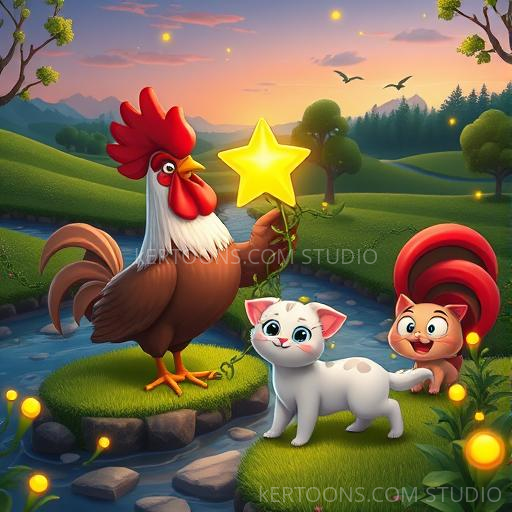 Following Luna’s guidance, Rocky and Whiskers ventured beyond the farm, through lush green fields and sparkling streams. They faced tiny challenges—crossing a wobbly bridge and solving a riddle from a wise old owl. At last, they found the shining star caught in a tangled vine. With teamwork and kindness, they freed the star, which shimmered brighter than ever. Luna thanked them with a sprinkle of fairy dust, and the star twinkled happily in the sky. Rocky and Whiskers returned home, their hearts full of joy, knowing that friendship and courage can light up the darkest night.