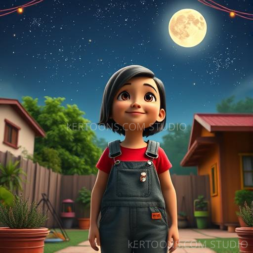 In a cozy village nestled amidst lush fields and colorful houses, Neema gazed up at the glittering night sky. Her eyes sparkled with wonder as she watched the glowing moon, dreaming of building a magical machine to visit it. Her backyard workshop was filled with shimmering wires, shiny metal parts, and her favorite toy rocket, all waiting for her imagination to bring them alive. Neema felt a warm sense of hope and curiosity, knowing her dreams could reach beyond the stars.