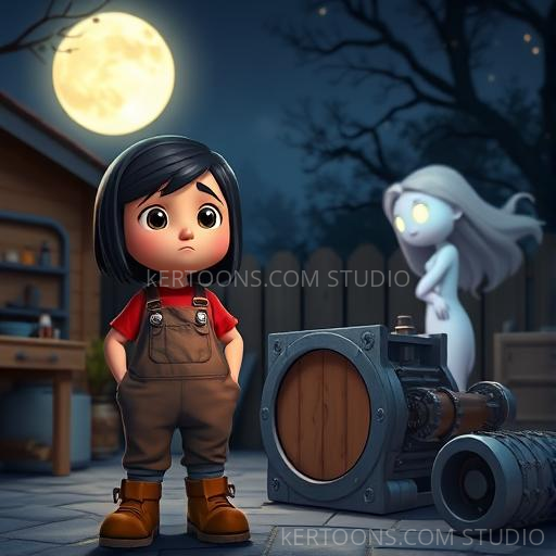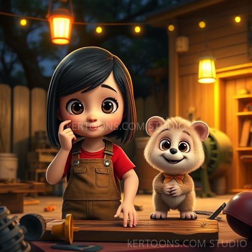 With Tiko’s cheerful encouragement, Neema worked tirelessly, fixing and adjusting her machine. But setbacks came—parts broke, and her fears grew stronger. One night, feeling overwhelmed, Neema almost gave up, tears welling in her eyes. Tiko gently nudged her, reminding her of her dream and the magic of trying. Inspired by her friend’s kindness, Neema took a deep breath, renewed her hope, and kept working, believing her dream was worth every effort.