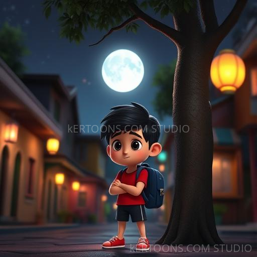 One evening, Aarav felt a strange flutter of worry. The moon’s steady gaze made him feel uneasy, as if he was being watched too closely. He tried to hide behind trees, run around the village, and even look away, but the moon’s silvery light always found him again. His little heart beat faster with confusion and a tiny flicker of fear. The night suddenly felt a little darker, and Aarav wondered if the moon was a little too curious.