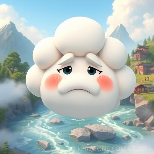 Cloudy tried to make different sounds—he tapped on mountain peaks, rustled through the trees, and even splashed on the river’s surface. But no matter how hard he tried, the sounds didn’t feel right or loud enough. He looked down at the villagers waiting eagerly, their faces filled with hope. Cloudy’s fluffy face drooped with worry, feeling unsure if he could create the magic he dreamed of. The sky seemed silent, and Cloudy wondered if his efforts were enough.