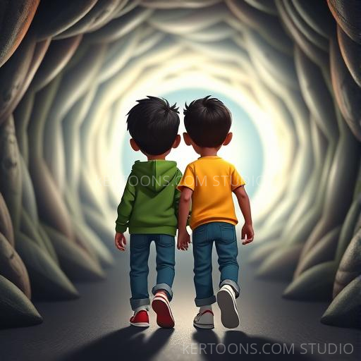 Finally, Ram and Shyam emerged from the cave, feeling relieved and grateful. They hugged each other tightly, promising never to enter restricted areas again. Back home, they shared their adventure with friends and family, realizing that curiosity is wonderful but safety is even more important. Their brave hearts had grown wiser, and they knew that listening to elders' warnings kept everyone safe and sound.