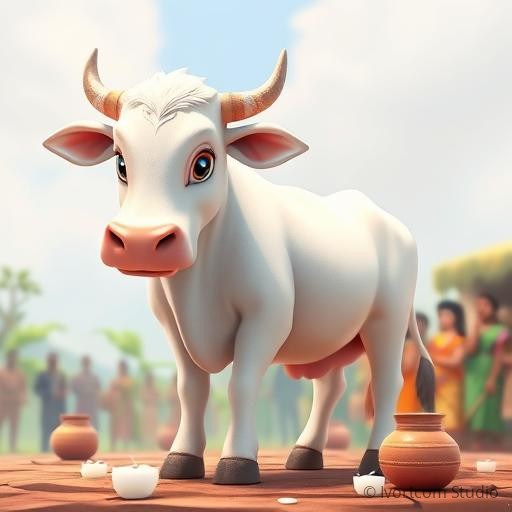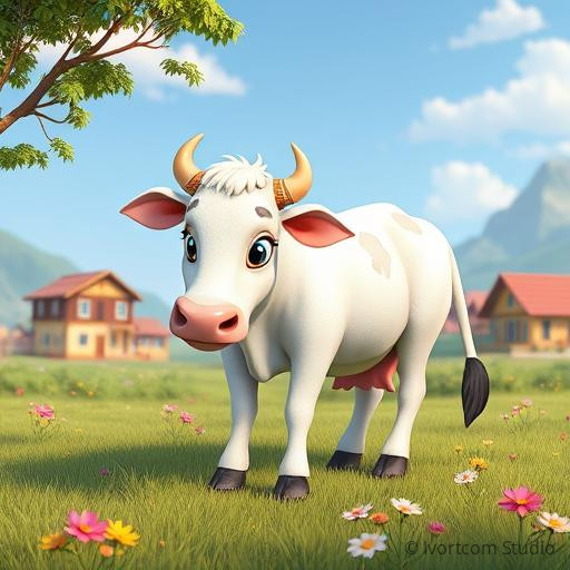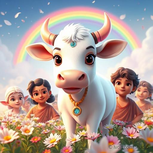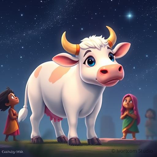Scene 1: In a small village nestled in the lush green valleys of India, there lived a cow named Nandini. She had a shimmering white coat and eyes that sparkled like diamonds.