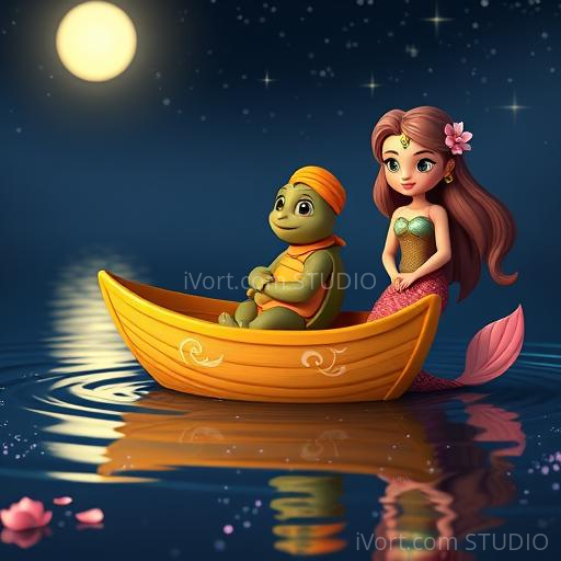 As Chotu sailed further, he reached a shimmering lake where the water sparkled like a thousand diamonds. Suddenly, a gentle voice echoed from the water—an enchanting mermaid named Meera, with flowing hair decorated with lotus flowers and a shimmering sari of sea-green. She sang a lullaby that made the stars dance brighter. Meera told Chotu, 'The stars are your friends, and they shine for dreamers like you. Trust your heart, and you will find your way.' Chotu felt a warm glow inside, knowing he was not alone on his journey.
