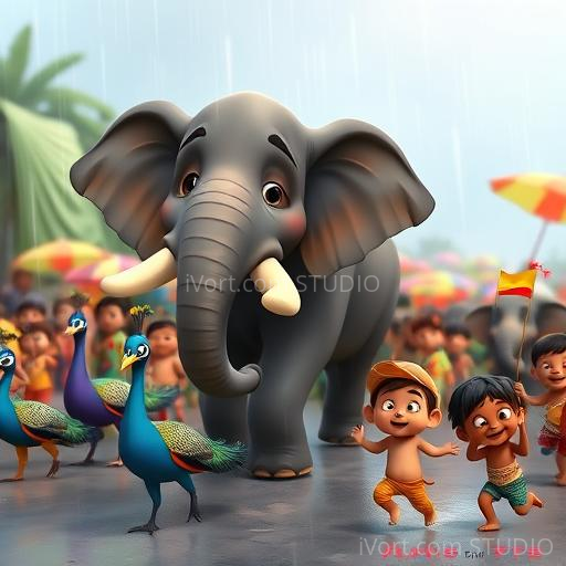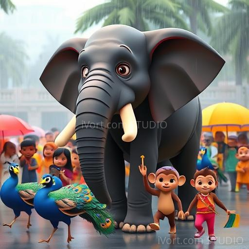 With his big, gentle steps, Appu takes the lead, trumpeting loudly to rally everyone. His friends, the peacocks, monkeys, and children, follow happily, waving colorful flags and singing traditional folk songs. The rain makes the parade even more lively, with everyone dancing under the big banyan tree decorated with marigold garlands. Appu feels proud and joyful, knowing he is making everyone smile despite the weather.