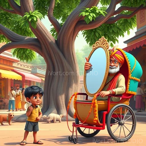 As Arjun pondered his shadow, a mysterious merchant appeared out of nowhere, riding a colorful rickshaw decorated with marigold garlands and bright fabrics. The merchant had a twinkle in his eye and wore a turban adorned with feathers. He offered Arjun a shiny, shimmering mirror, saying, 'Trade your shadow for a glimpse of your true self.' Arjun hesitated, curious about what lay beyond the mirror, and wondered if trading his shadow was a good idea.