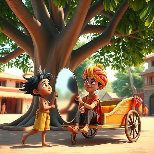 With a deep breath, Arjun traded his shadow for the shimmering mirror. Suddenly, he felt lighter, as if a part of him had vanished. At first, he was excited to see his reflection, but soon he realized he couldn't feel the warmth of the sun or the cool breeze on his skin. His friends called out to him, but he couldn’t see his shadow to recognize himself. Arjun’s heart felt heavy—he understood that his shadow was a part of who he was, a symbol of his identity and connection to the world around him.