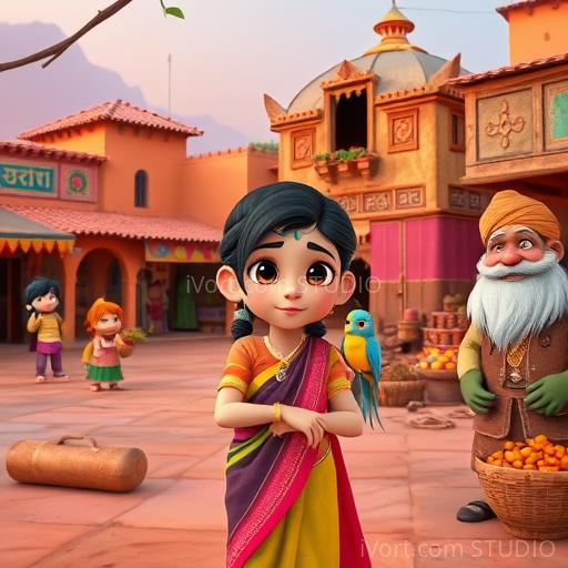 In the heart of a vibrant Indian desert village, the sun shone brightly over the shimmering Golden Oasis, a place believed to hold magical waters. One morning, the villagers woke up to find the sparkling water mysteriously vanished! Little Rani, a curious girl with bright eyes and a colorful sari, decided to solve the mystery. She felt a flutter of excitement and a little worry, knowing that the oasis was vital for everyone’s happiness. With her trusty pet parrot, Mithu, she set out on her adventure, determined to find the thief and restore the oasis’s magic.