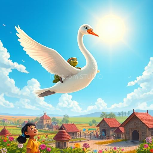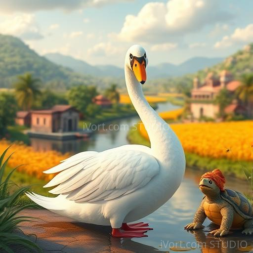 In a lush Indian village nestled between golden fields and a shimmering river, the sun was high in the sky, but something unusual was happening. A gentle, wise swan named Saraswati, known for her shimmering white feathers and graceful glide, was preparing for a special journey. She wondered how she could bring the warmth of the noon to the children playing under the banyan tree, as the sun seemed to be hiding behind clouds today. Saraswati decided to take on a magical adventure to carry the noon light across the sky, so everyone could enjoy the bright, cheerful afternoon.