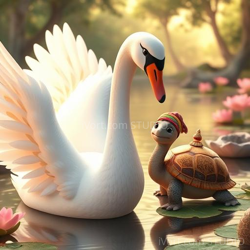 Saraswati flapped her elegant wings, shimmering with hints of gold and silver. As she did, a gentle breeze whispered ancient Indian lullabies, and her feathers sparkled like tiny stars. She knew she needed help to carry the bright noon light all the way to the farthest corners of the village. Suddenly, a wise old turtle named Kavi, who wore a tiny turban and had a twinkle in his eye, approached her. 'I will help you, Saraswati,' said Kavi, 'with my slow but steady steps, we can make sure the sun’s warmth reaches everyone, even the smallest children playing in the shadows.'