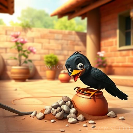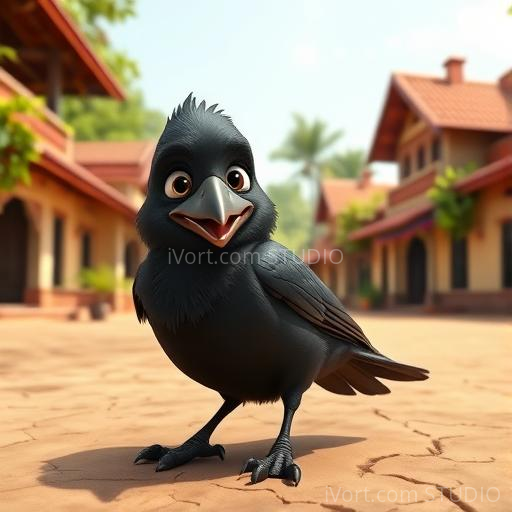 In a vibrant Indian village, on a hot summer day, a small black crow named Kavi feels very thirsty. The sun blazes brightly, and the dry land cracks beneath his tiny claws. Kavi looks around, fluttering his wings anxiously, wondering how to find water. His little beak opens wide as he searches for a cool drink, but all the ponds and wells seem empty. Despite his hunger and thirst, Kavi remains determined, thinking of a clever way to quench his thirst. His bright eyes sparkle with hope as he begins to plan his next move.