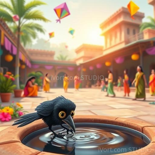 Kavi hops to the edge of the pot and dips his beak into the cool, refreshing water. He takes a long, satisfying sip, feeling grateful and happy. The sun continues to shine brightly, but now Kavi feels refreshed and energized. Nearby, children playing with colorful kites and women in vibrant sarees watch him with smiles. Kavi flaps his wings happily, knowing that his cleverness saved the day. He chirps a joyful song, sharing his happiness with everyone around.