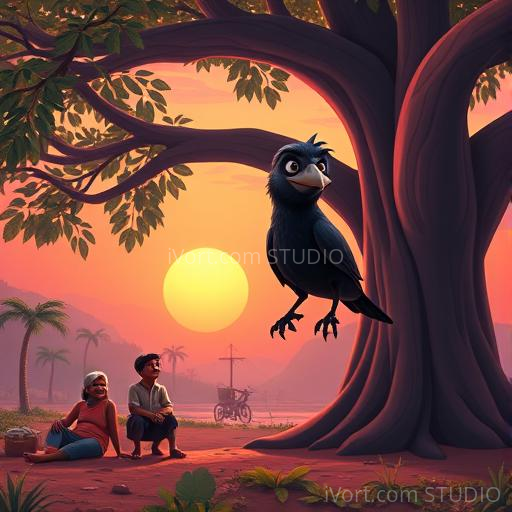 As the day ends, Kavi perches on a tree branch, looking at the setting sun. He remembers that being clever and thinking carefully can solve even the biggest problems. The villagers gather around, sharing stories and snacks, grateful for Kavi’s quick thinking. Kavi chirps softly, feeling proud and wise. The story reminds children that using their brains and staying calm can help them overcome challenges, just like Kavi did. And always remember, a little kindness and cleverness can make a big difference!