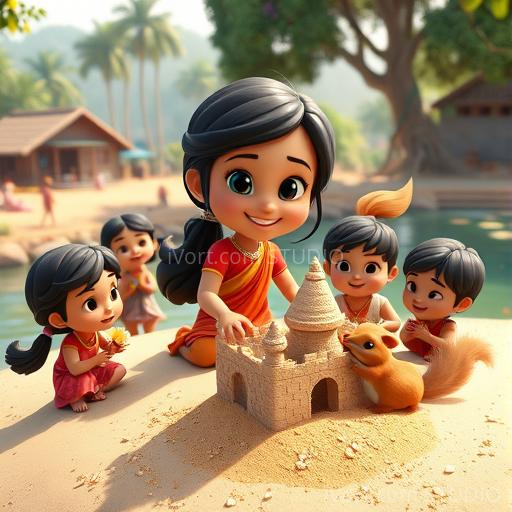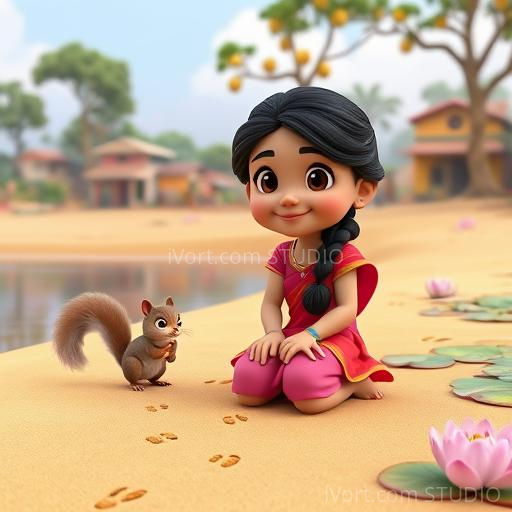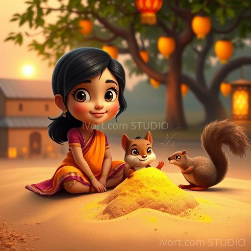 In a lively Indian village nestled between golden fields and lush mango trees, little Rani loved playing on the warm sandy banks near her home. One sunny morning, she noticed that the soft, shimmering sand she had collected yesterday was mysteriously missing. Curious and a little worried, she decided to find out who was taking her precious sand. As she looked around, she saw tiny footprints leading toward the village pond, sparkling under the bright sun. Rani’s eyes sparkled with curiosity—who could be sneaking around stealing her sand? She felt a mix of excitement and determination to uncover the secret behind the missing sand.