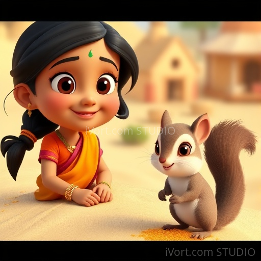 Following the tiny footprints, Rani tiptoed toward the village pond. To her surprise, she saw a small, shy squirrel with a fluffy tail and bright eyes, clutching a handful of shiny, golden sand. The squirrel looked guilty but adorable. Rani gently asked, 'Why are you taking my sand, little friend?' The squirrel squeaked softly, 'I wanted to make a tiny castle for my squirrel family, but I didn’t mean to take too much.' Rani’s heart softened. She realized the squirrel’s secret was a simple wish—to create a tiny castle for his family’s happiness. Rani smiled, understanding that everyone has a special reason for their actions.