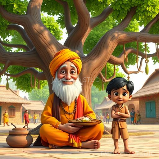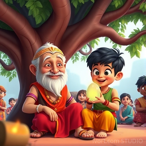 In a small vibrant village in India, under the shade of a mighty banyan tree, an old astrologer named Baba Ram sat with his colorful cloth spread on the ground. Children gathered around him, curious about the stars and their secrets. Today, Baba Ram faced a challenge: a young boy named Arjun wanted to know his future, but Baba Ram had to decide whether to tell the truth or play a little trick. The air was filled with the scent of jasmine and the cheerful chatter of villagers, setting a magical, mysterious mood.