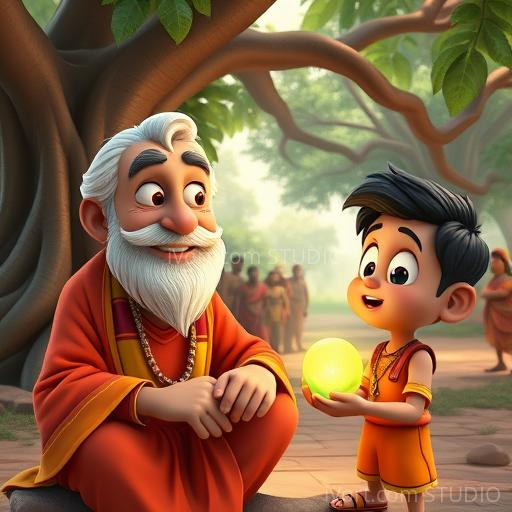 Baba Ram looked at Arjun with twinkling eyes and said, 'Today, I will tell you a secret. Your future holds a treasure hidden deep in the forest, but beware—sometimes, what we see is not always what is true.' Arjun’s eyes widened with excitement and a hint of doubt. The villagers listened closely, sensing that something mysterious was about to unfold. Baba Ram’s words stirred a mix of hope and curiosity, making everyone wonder about destiny and the power of stories.