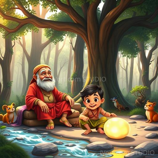 The next morning, Arjun set out into the forest, guided by Baba Ram’s words. As he ventured deeper, he found a small, sparkling stream and a mysterious glowing stone. Just then, Baba Ram appeared, smiling kindly. 'Remember,' he said, 'sometimes stories are like the banyan’s roots—they twist and turn. What you find depends on your heart.' Arjun hesitated, realizing that the real treasure was not just the shining stone but the courage to trust his own judgment. The village watched from afar, hopeful and proud of the young boy’s bravery.