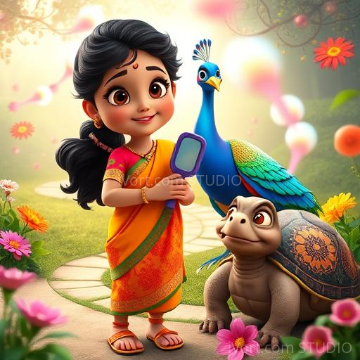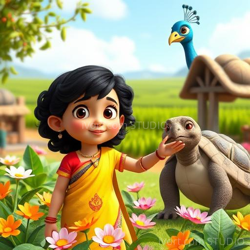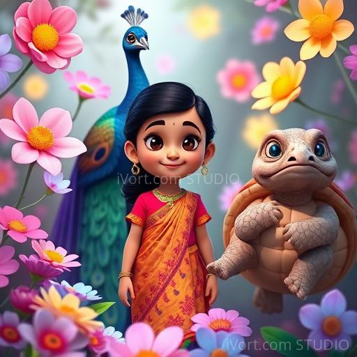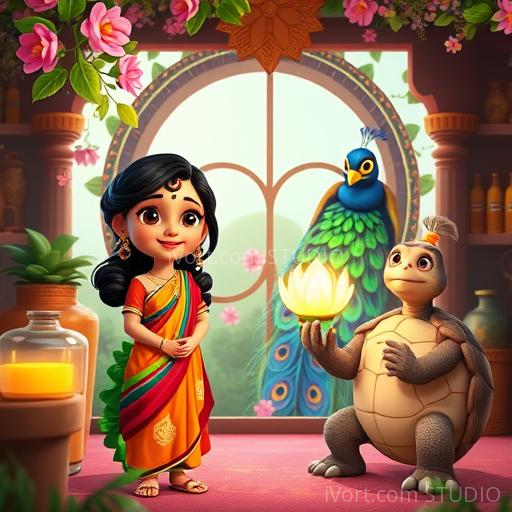 With a brave heart, Anika began her quest through the fragrant garden. She tiptoed past singing jasmine vines and giggling marigolds. Along the way, she met a wise old turtle who gave her a tiny mirror. 'Use this to see beyond the surface,' he advised. Anika carefully looked into the mirror and saw a faint, glowing flower hidden behind a curtain of jasmine. Heart pounding with joy, she reached out and gently plucked the shimmering Lotus of Love, feeling its warmth and kindness radiate through her fingertips.