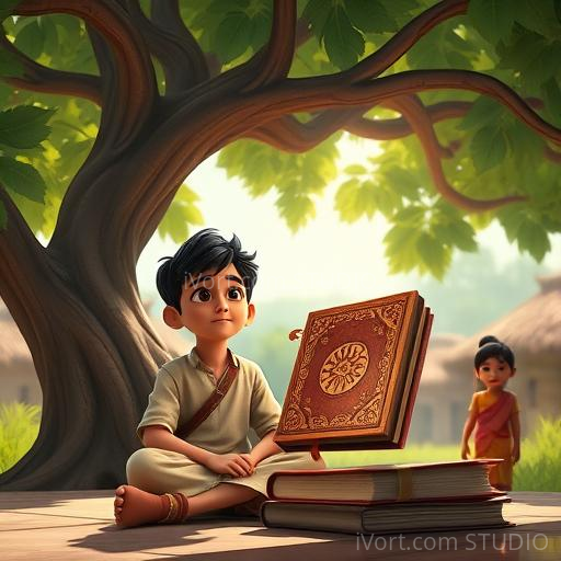 In a small, colorful Indian village nestled between lush green fields and shimmering rivers, little Aarav loved reading stories about brave princes and clever animals. One rainy afternoon, as he sat under the old banyan tree, he found a dusty, ancient book with golden patterns on its cover. Curious, Aarav opened it, but instead of words, the pages shimmered and whispered, 'Ask me a question.' His eyes widened with wonder. Suddenly, the book glowed softly, inviting him to speak. Aarav hesitated, then whispered, 'Who are you?' The book replied in a gentle voice, 'I am the Book That Writes Back.' Excited and a little nervous, Aarav realized this was no ordinary book—this was a magical friend waiting to tell him stories and secrets of the universe.
