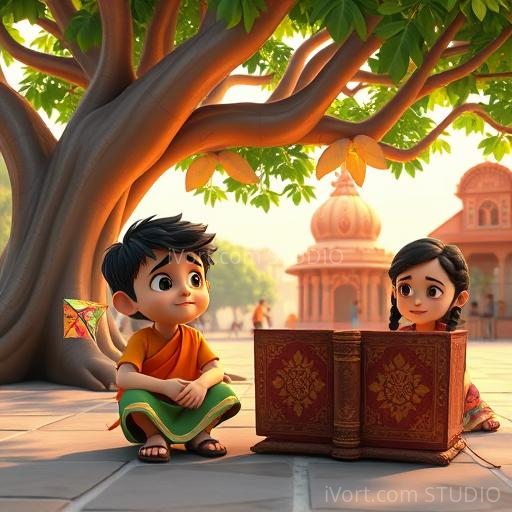One day, Aarav faced a challenge—he wanted to help his friend Meena, who was feeling sad because her favorite kite was torn. Remembering the magic book, Aarav asked, 'Can you help me find a way to cheer Meena up?' The book responded by writing a story about a brave boy who fixed his torn kite and flew it high in the sky, just like a hero. Inspired, Aarav gathered colorful threads and paper, and with his mother’s help, they made a new, beautiful kite. When he gave it to Meena, her face lit up with joy. She ran outside, and together they watched the kite dance in the bright blue sky, feeling happy and grateful for the magic of stories and friendship.