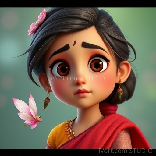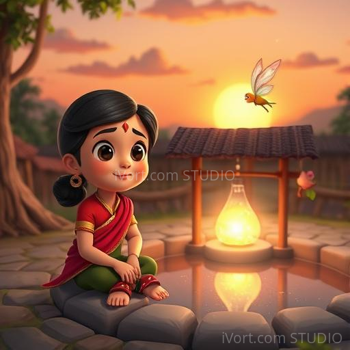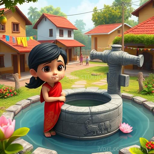 In a small, colorful Indian village nestled between lush green fields and tall mango trees, there was an ancient well known as the 'Weeping Well.' Legend whispered that it cried whenever someone was sad nearby. One hot summer day, little Riya, a curious girl with bright eyes and a red dupatta, heard the well's faint sobs and decided to find out why it was crying. She tiptoed closer, feeling a mix of wonder and concern, determined to uncover the secret behind the weeping water.