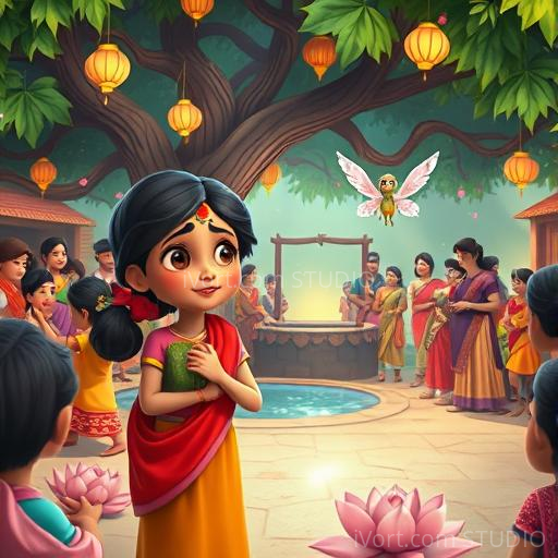 The next morning, Riya gathered her friends and family in the village square. She told them stories from her grandmother about brave kings, clever animals, and magical forests. Everyone listened with wide eyes and big smiles. They sang folk songs and danced around the banyan tree, filling the air with laughter and music. As they shared their joy, the well’s sobs turned into gentle, happy gurgles, and the water sparkled brighter than ever, reflecting the festive spirit of the village.
