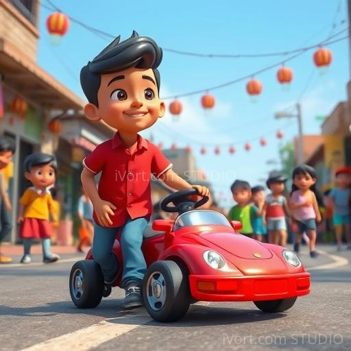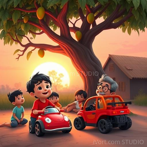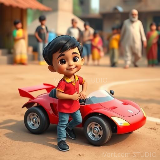 In the lively village of Ramnagar, young Aarav was bursting with excitement. Today was the day he would race his shiny red toy car against his friends for the very first time. His heart fluttered with curiosity and a little nervousness. As he looked at the colorful race track made of chalk on the dusty ground, he wondered if he could keep up with his friends. The sun shone brightly, casting warm golden light over the cheerful village, filled with the scent of marigolds and jasmine. Aarav took a deep breath, ready to start his adventure.