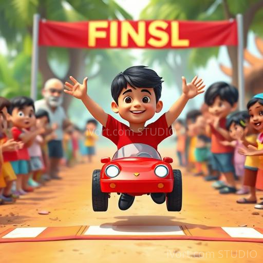 With determination shining in his eyes, Aarav’s car finally crossed the finish line! Although he didn’t win the race, he felt like a champion. His friends clapped and cheered, proud of his brave effort. Aarav realized that the real victory was in trying his best and sharing happy moments with friends. The village echoed with laughter and applause, as everyone celebrated the fun and friendship. Aarav’s heart swelled with joy, knowing that every challenge made him stronger and braver. From that day, he knew that winning was sweet, but trying and having fun was even sweeter.