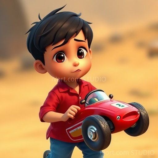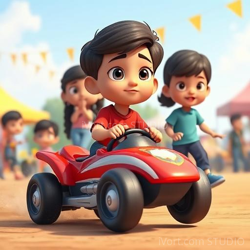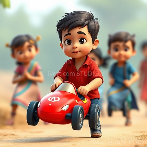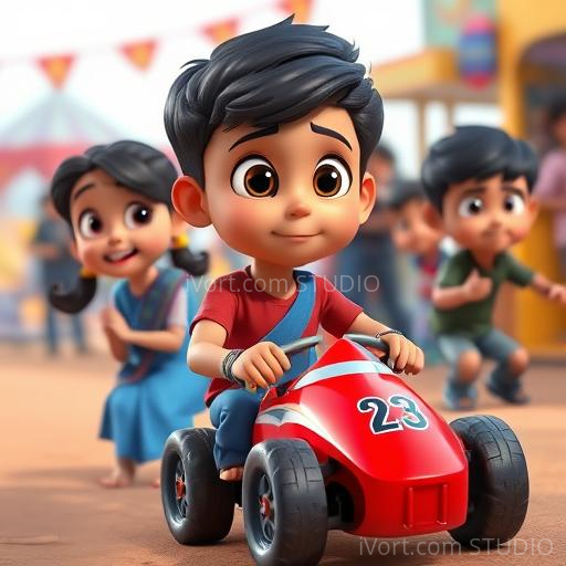 In a lively Indian village, young Arjun was excited but nervous. Today was his first time racing with his friends at the annual village fair. His shiny red toy race car gleamed under the bright sun, and his heart fluttered like a butterfly. Arjun wondered if he could keep up with his friends, Rina and Rahul, who were expert racers. As he took a deep breath, he remembered his grandfather’s words: 'Believe in yourself, and you will shine.' With a big smile, Arjun lined up at the starting line, ready for the adventure ahead.